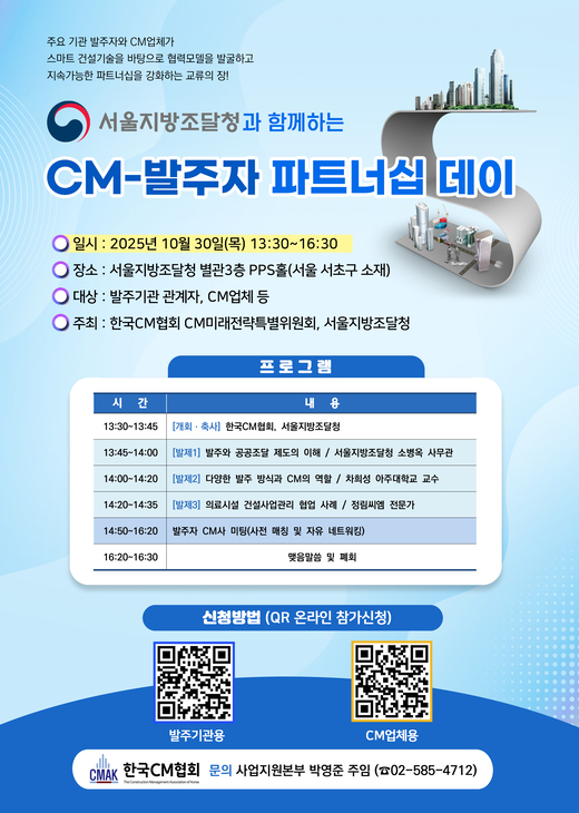 ¿ì¸® Çùȸ´Â ÁÖ¿ä±â°ü ¹ßÁÖÀÚ¿Í CM¾÷ü °£ÀÇ Çù·Â ¹× ÆÄÆ®³Ê½Ê ±¸ÃàÀ» Áö¿øÇϰíÀÚ¡¸¼¿ïÁö¹æÁ¶´Þû°ú ÇÔ²²ÇÏ´Â CM-¹ßÁÖÀÚ ÆÄÆ®³Ê½Ê µ¥ÀÌ¡¹¸¦ ¾Æ·¡¿Í °°ÀÌ °³ÃÖÇϰíÀÚ ÇÕ´Ï´Ù. º» Çà»ç°¡ ¼º°øÀûÀ¸·Î °³ÃÖµÇ¾î °Ç¼³»ê¾÷ ¹ßÀü¿¡ ±â¿©ÇÒ ¼ö ÀÖµµ·Ï °ü½ÉÀÖ´Â ÀÓÁ÷¿øºÐµéÀÇ ¸¹Àº Âü¿© ¹Ù¶ø´Ï´Ù.